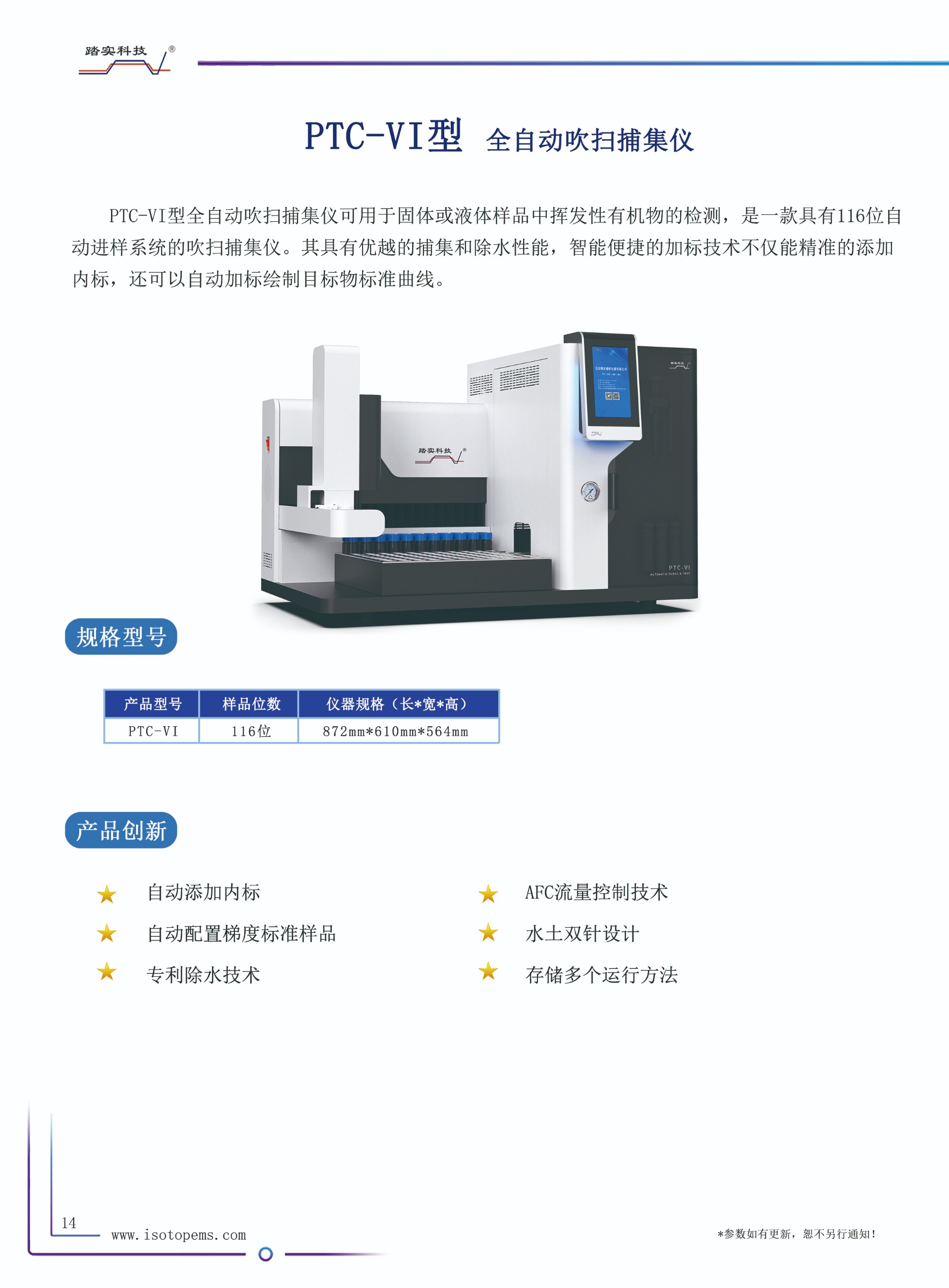 PTC-VI型全自動吹掃捕集儀可用于固體或液體樣品中揮發(fā)性有機(jī)物的檢測,是一款具有116位自動進(jìn)樣系統(tǒng)的吹掃捕集儀。其具有優(yōu)越的捕集和除水性能,智能便捷的加標(biāo)技術(shù)不僅能精準(zhǔn)的添加內(nèi)標(biāo),還可以自動加標(biāo)繪制目標(biāo)物標(biāo)準(zhǔn)曲線。通過與GC或GC-MS的聯(lián)用,可以廣泛應(yīng)用于環(huán)境分析,如飲用水、廢水、土壤中的有機(jī)污染物分析,也可用于食品中揮發(fā)物(如氣味成分)的分析等。該款儀器符合《HJ639-2012水質(zhì) 揮發(fā)性有機(jī)物的測定 吹掃捕集/氣相色譜-質(zhì)譜法》、《HJ686-2014水質(zhì) 揮發(fā)性有機(jī)物的測定 吹掃捕集/氣相色譜-質(zhì)譜法》、《HJ605-2011土壤和沉積物揮發(fā)性有機(jī)物的測定 吹掃捕集/氣相色譜-質(zhì)譜法》等標(biāo)準(zhǔn)。